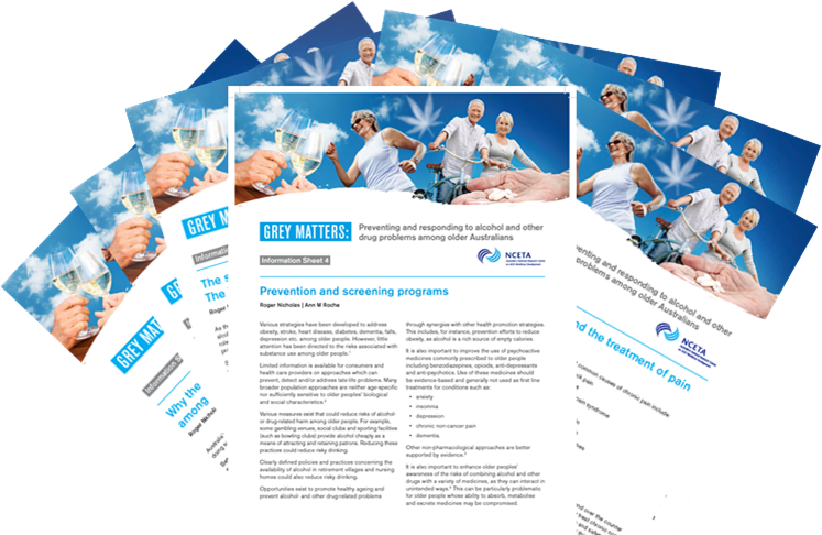 The National Centre for Education and Training on Addiction (NCETA) has produced Grey Matters, a series of seven information sheets to assist specialist and generalist health and welfare workers to better prevent, assess and respond to the needs of older people experiencing, or at risk of experiencing, alcohol and other drug (AOD) related harm.