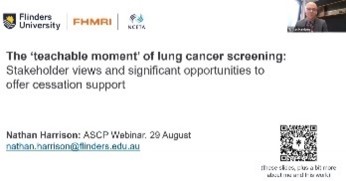Nathan Harrison (Flinders University PhD Candidate and Senior Research Officer, NCETA) recently had the opportunity to share some of his early PhD research in the August 2023 webinar held by the APSAD Smoking Cessation Professionals (ASCP) Special Interest Group. In his webinar, Nathan provided an overview of how lung cancer screening presents a unique 'teachable moment' for smoking cessation among high-risk groups, and reported qualitative findings on how smoking cessation interventions might be embedded into targeted lung cancer screening in Australia. A webinar recording can be viewed here. Nathan thanks A/Prof Ryan Courtney (NDARC and ASCP-SIG co-chair) for the invitation and opportunity to share these findings with ASCP members.