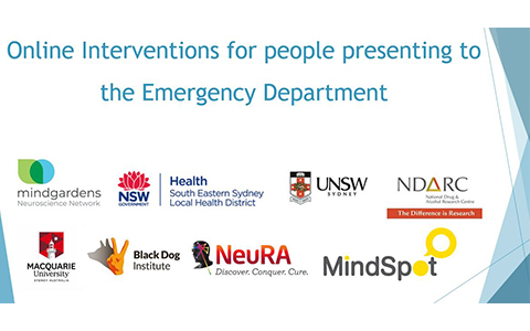 Summary:This project will estimate the prevalence of chronic pain in people who attend emergency departments (ED) with suicidal behaviours or self-harm. It will also investigate the feasibility of offering information, in the ED setting about online interventions for the treatment of chronic pain, depression and /or anxiety. Individuals attending ED with self-harm or suicidal behaviours will be offered the opportunity to self-enrol in a freely-available clinician-supported intervention for chronic pain, depression and /or anxiety delivered by the digital mental health service MindSpot.